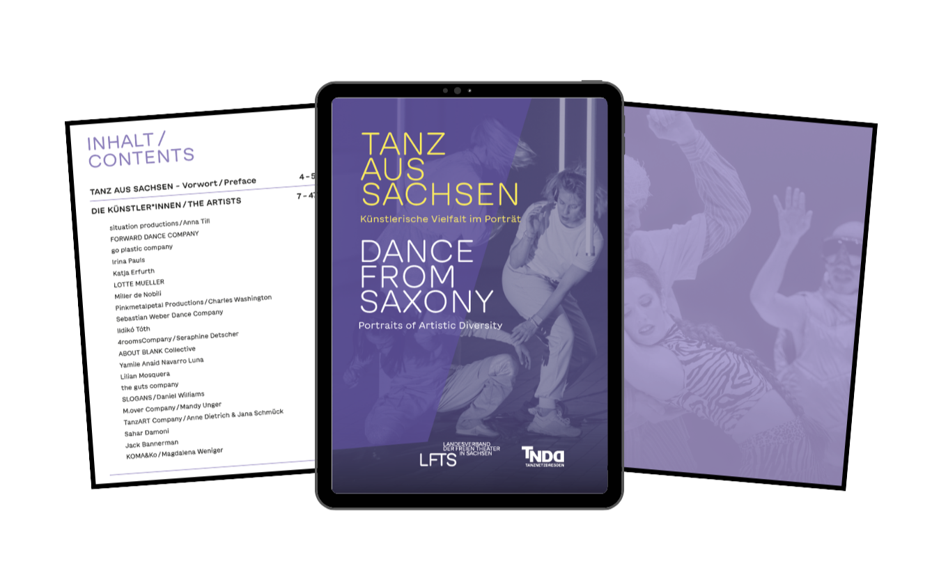 Die Broschüre TANZ AUS SACHSEN wurde vom TanzNetzDresden und dem Landesverband der Freien Theater in Sachsen erstellt und stellt die Vielfalt und Innovationskraft der aktuellen Tanzszene im Freistaat vor. Die Broschüre portraitiert 21 herausragende Künstler*innen und Ensembles, die traditionelle Tanzformen mit modernen, interdisziplinären Ansätzen verbinden und bietet einen Einblick in spannende, teils gesellschaftskritische, teils poetische Tanzproduktionen. Sie zeigt, wie Künstler*innen in Städten wie Leipzig, Dresden und Chemnitz, aber auch in ländlichen Regionen, mit ihren Arbeiten neue künstlerische Perspektiven eröffnen und verschiedene Tanzstile wie zeitgenössischen Tanz, Tanztheater, Stepptanz und Breaking verschmelzen lassen.